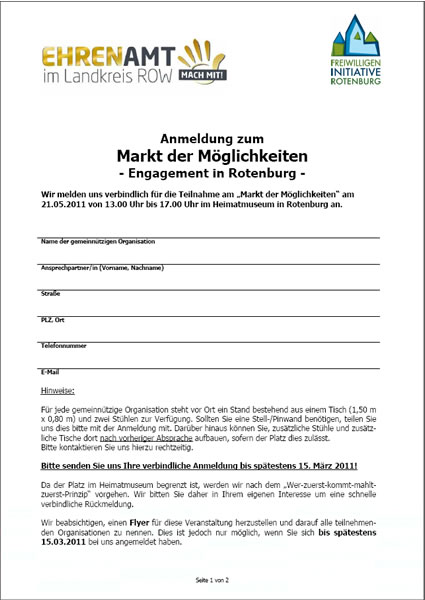 Sehr geehrte Damen und Herren, liebe Freiwillige und Ehrenamtliche, die Koordinierungsstelle für ehrenamtliche Arbeit veranstaltet in Kooperation mit der Freiwilligeninitiative Rotenburg am 21. Mai 2011 erstmals einen "Markt der Möglichkeiten - Engagement in Rotenburg". Hierzu laden wir Sie ganz herzlich ein. Was ist der "Markt der Möglichkeiten"? Gemeinsam präsentieren sich am 21.05.2011 von 13.00 bis 17.00 Uhr gemeinnützige Organisationen aus dem Stadtgebiet Rotenburg im Heimathaus in Rotenburg. Sie haben dort die Gelegenheit Werbung für Ihre Organisation/Ihre Angebote zu machen, Mitglieder zu gewinnen und vor allem neue Freiwillige zu finden! Wir können dort zusammen zeigen, was Rotenburg alles zu bieten hat, wie viele Menschen sich bereits freiwillig hier engagieren und wie vielfältig die Engagementmöglichkeiten bei uns sind. In der Gemeinschaft haben wir eine größere Aufmerksamkeit in der Öffentlichkeit und können viel mehr Bürgerinnen und Bürger erreichen. Der Erfolg dieser Veranstaltung hängt also ganz von Ihnen ab! Machen Sie mit!? Die Teilnahme ist kostenlos. Die organisatorische Abwicklung übernimmt die Koordinierungsstelle für ehrenamtliche Arbeit. Da wir jedoch nur begrenzt Platz haben, bitten wir Sie - in Ihrem eigenen Interesse - um eine möglichst schnelle verbindliche Rückmeldung. Hier gilt: wer zuerst kommt, mahlt zuerst. Außerdem planen wir einen Flyer für diese Veranstaltung und bitten Sie daher, sich bis spätestens 15. März 2011 bei uns anzumelden. In der Anlage finden Sie das Anmelde-Formular und eine Skizze des Veranstaltungsraumes. Sie möchten gerne vor Ort etwas vorführen, das Rahmenprogramm mit gestalten oder im Außenbereich ausstellen? Kein Problem, bitte nehmen Sie vorab Kontakt mit uns auf, wir versuchen alle Ideen möglich zu machen. Wir freuen uns sehr auf Ihre Rückmeldungen, Anregungen und vor allem Ihre Anmeldungen! Wenn Sie Interesse oder Fragen haben, rufen Sie mich bitte an oder senden Sie mir eine E-Mail an: ehrenamt[at]lk-row[dot]de.