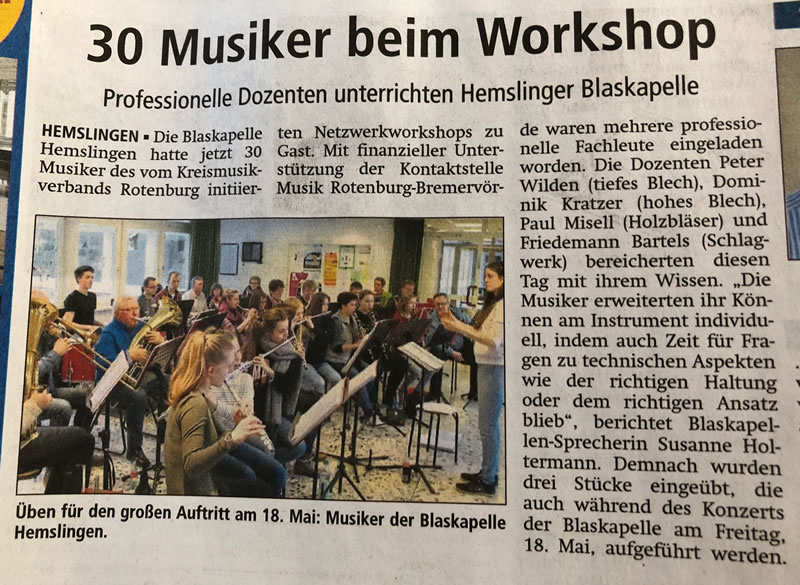 Rotenburger Kreiszeitung - 03.03.2018 - 30 Musiker beim Workshop (zum Vergrößern bitte auf die Abbildung <klicken>)