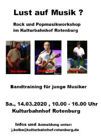 Der 1. Workshop im Jahr 2020 des Kulturbahnhofs in Kooperation mit der Kontaktstelle Musik findet am Samstag, den 14. März 2020 statt. Alle interessierten Instrumentalisten und Sänger/innen die Möglichkeit sich im Zusammenspiel mit anderen auszuprobieren. Der Workshop richtet sich in diesem Jahr besonders jungen Musikern. Der Musikmix wird aus Rock und Popmusik bestehen. Gitarristen (Akustische wie auch E-Gitarre) , Bassisten, Schlagzeuger und wie schon erwähnt Sänger und Sängerinnen sind herzlich eingeladen sich unter der Anleitung der drei erfahren Dozenten im Bandspiel zu üben. Mitmachen können alle, die Vorkenntnisse an den genannten Instrumenten haben - Anfänger wie Fortgeschrittene. Ob es sich um bestimmte Musikstücke handelt, die eingeprobt werden sollen oder auch um Themen wie Rhythmik, Musiktheorie und Arrangement. Die erfahrenen Dozenten des Kuba haben für alle Fragen die passenden Antworten. Wie das Musik machen mit unterschiedlichen Instrunmenten in der Band funktioniert wird intensiv geübt und die Ergebnisse werden wie immer im Anschluss im kleinen Abschlusskonzert vorgestellt. Das bewährte Dozententeam besteht aus Pat Dalton (Gesang, Bass und Gitarre), Jürgen Kolbe (Gitarre, Bass und Musiktheorie) und Jörg Meyer (Schlagzeug, Perkussion). Anmeldungen per E-Mail an: j.kolbe@kulturbahnhof-rotenburg.de. Anmeldeschluss ist Samstag, der 07.03.2020.