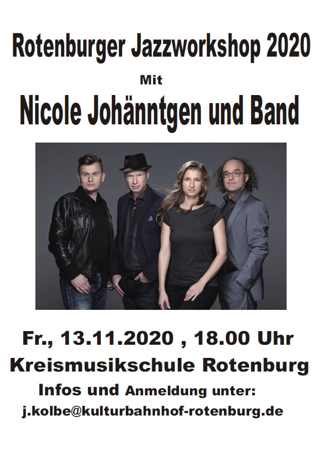 ...mit Nicole Johänntgen und ihrer Band in Rotenburg - ...für alle Instrumente - praxisorientiert und mit viel Freude für Anfänger und Fortgeschrittene Gerade hat sie ihr 1. Lehrbuch geschrieben: Die in Zürich beheimatete, weltweit tourende Saxophonistin Nicole Johänntgen kommt mit ihrer Band NicoleJo wieder in die Kreisstadt. Jazzworkshops in Rotenburg haben eine lange Tradition. Die Veranstaltung findet in diesem Jahr bereits zum 13. Mal statt. Neu ist, dass eine professionelle Band eingeladen ist den Workshop zu gestalten. Der Workshop findet am Freitag, den 13.11.2020 um 18.00 Uhr in der Kreismusikschule Rotenburg statt. Anmeldung bis zum 06.11.2020 unter j.kolbe@kulturbahnhof-rotenburg.de. Infos auch unter Tel. 04261 82859 (Jürgen Kolbe). Die Teilnahmegebühr beträgt 25,00 Euro. Neben Saxophonisten und anderen Bläsern sind auch Pianisten / Keyboarder, Bassisten, Schlagzeuger und Gitarristen eingeladen unter der Anleitung der Band Tipps und Input für ihr eigenes Spiel zu bekommen. Die Band Nicole Jo ist seit 1998 auf Europas Jazzbühnen zu sehen und zu hören. TV-Beiträge wie ARTE liessen ihr Stammpublikum wachsen. Sie geben Konzerte und geben ihr Wissen weiter. In dem 3-stündigen praxisorientierten Workshop geht es um das gemeinsame Spielen, die Improvisation, Bandzusammenarbeit und musikalische Interaktionen. Es wird ein Song erarbeitet und Bühnenpräsenz geübt. Die Praxis steht im Vordergrund und soll die Teilnehmerinnen und Teilnehmer ermutigen Neues auszuprobieren. Das Ziel ist es alle Teilnehmerinnen und Teilnehmer zum nächsthöheren Spiellevel zu verhelfen. Für Saxophonisten gibt es darüberhinaus einen Exkurs in die Slaptechnik/Beatboxing.