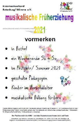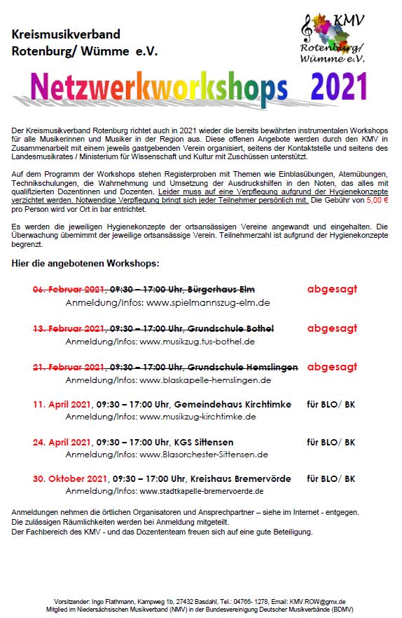 Der Kreismusikverband Rotenburg (KMV) richtet auch in 2021 wieder die bereits bewährten instrumentalen Workshops für alle Musikerinnen und Musiker in der Region aus. Diese offenen Angebote werden durch den KMV in Zusammenarbeit mit einem jeweils gastgebenden Verein organisiert, seitens der Kontaktstelle Musik Rotenburg-Bremervörde e.V. und seitens des Landesmusikrates / Ministerium für Wissenschaft und Kultur mit Zuschüssen unterstützt. Auf dem Programm der Workshops stehen Registerproben mit Themen wie Einblasübungen, Atemübungen, Technikschulungen, die Wahrnehmung und Umsetzung der Ausdruckshilfen in den Noten, das alles mit qualifizierten Dozentinnen und Dozenten und zudem in einer größeren Registergemeinschaft als oftmals im heimischen Orchester gewohnt.