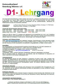 Inhalte und Ziele für diesen D1–Lehrgang sind abgestimmt auf die Bedürfnisse der noch in der Ausbildung befindlichen Musiker unserer Musikvereine. Die Teilnehmer sollten bisher eine 2-jährige Instrumentalausbildung erfahren haben und mindestens 12 Jahre alt sein. Abweichungen sind nach Rücksprache möglich. Die Lehrgangsgebühr beträgt 80,00 Euro (Gasthörer 40,00 Euro). [Weitere Informationen hier im Download (PDF, 167 kb) der Ausschreibung]