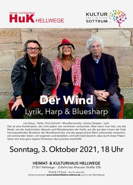 Die Kulturinitiatiev Sottrum e.V. schreibt: Liebe Freundinnen und Freunde unserer Konzertreihe im HuK-Hellwege, wir alle wissen, wie sehr das kulturelle Leben in Zeiten der Pandemie zum Erliegen gekommen ist. Inzwischen ist zwar noch keine Entwarnung - aber eine Erleichterung eingetreten, mit der wir die Konzerte des letzten Quartals 2021, unter Berücksichtigung der geltenden Hygienemaßnahmen, durchführen möchten. (3G-Regelung: Genesen, geimpft, getestet) Leider können wir nur einer begrenzten Personenzahl Einlass gewähren und bitten Sie darum, die Karten über unseren Kartenshop bis drei Tage vor Konzertbeginn zu erwerben. https://www.kulturinitiative-sottrum.de/kartenshop/ Wir freuen uns sehr, Ihnen und Euch die Lesung des Langgedichtes von und mit Johano Strasser ankündigen zu können. Musikalisch wird er begleitet von Lilo Kraus, Harfe und Chris Schmitt, Mundharmonika.