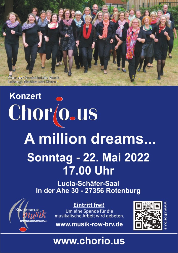 Mit dem Motto "A million dreams" meldet sich der Chor Chorious der Kontaktstelle Musik Rotenburg Bremervörde e.V. nach einer zweijährigen Coronapause mit einem Konzert zurück. Am 22.05.2022 findet um 17 Uhr im Lucia-Schäfer-Saal Rotenburg das langerwartete Chorkonzert statt. Der Eintritt ist frei, es wird um eine Spende für die musikalische Arbeit gebeten. Ganz entsprechend des Konzerttitels "A million dreams" werden die Zuhörenden in verschiedene Welten eintauchen können. Dabei geht es in die Welt von The Greatest Showman, Die Schöne und das Biest und Calum Scott. Bei dem Konzert wird es nicht nur etwas zu hören geben, sondern auch zu sehen, denn Chorious verbindet in seiner Arbeit zunehmend Chorgesang mit Choreographie. Trotz Lockdownphasen und eingeschränkten Probenmöglichkeiten hat sich Chorious durch das große Engagement der Sängerinnen und Sänger viele neue Songs überwiegend aus den Bereichen Pop- und Filmmusik erarbeitet, die jetzt darauf warten einem Publikum präsentiert zu werden. Ab Juni startet Chorious in eine neue Probenphase, zu der interessierte Sängerinnen und Sänger gerne einsteigen können. Weitere Infos gibt es hier oder auf Anfrage.