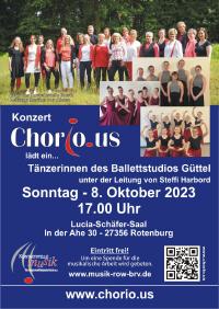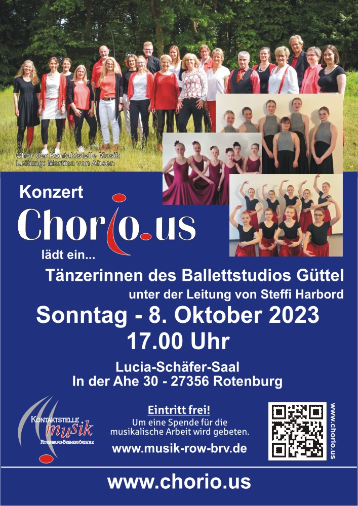 Let's dance and sing - Gemeinsames Konzert von Chorious und dem Ballettstudio Güttel Am 08.10.2023 findet das diesjährige Konzert von Chorious um 17 Uhr im Lucia-Schäfer-Saal in Rotenburg statt. Unter dem Motto "Chorious lädt ein…" wird das Konzert gemeinsam mit der Tanzdozentin Steffi Harbord und Tänzerinnen des Ballettstudios Güttel gestalten. Ein zentraler Bestandteil von Chorious ist die Verbindung von Chorgesang und Choreografie. Das Publikum darf sich somit über ein abwechslungsreiches Programm freuen, welches visuell und akustisch viel zu bieten hat. Neben einigen bekannten Stücken, wie Evermore und A Million dreams können sich die Zuhörenden auch auf einige Uraufführungen freuen. In diesem Jahr sind dies zum Beispiel Stücke, wie Shut up and dance und Another day of sun. Der Eintritt für das Konzert ist kostenlos, um Spenden für die musikalische Arbeit wird gebeten. Es bietet eine schöne Gelegenheit Chorious wieder in Action zu erleben.