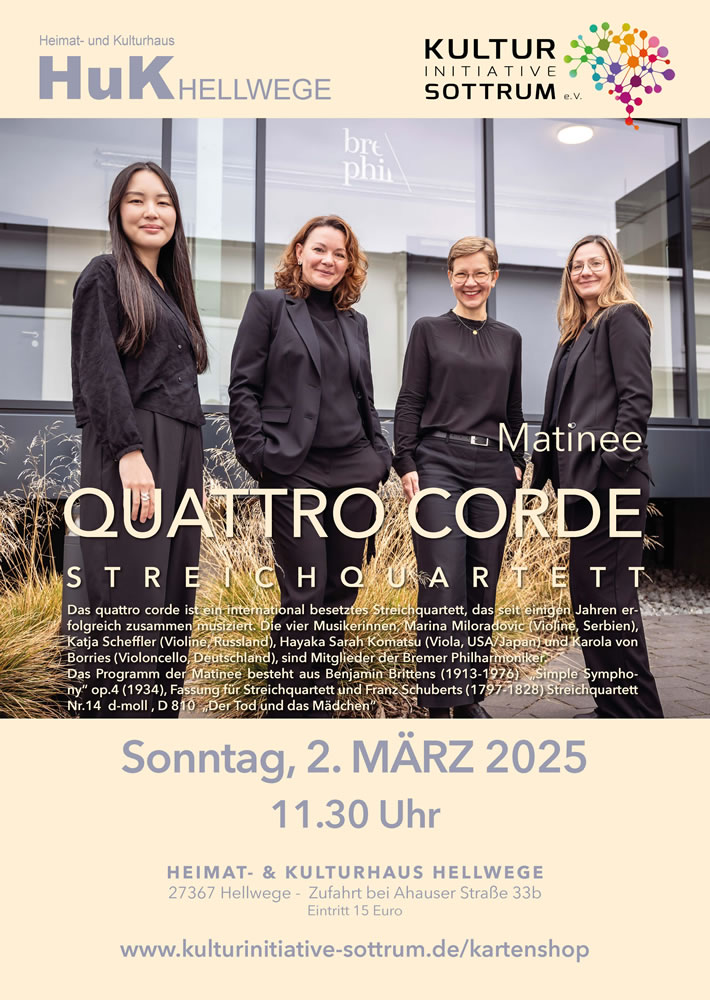Liebe Musikfreunde/-innen, nach einer kleinen Winterpause fahren wir mit unserer HuK-Konzertreihe fort und freuen uns sehr, dass wir das Bremer Streichquartett "Quattro Corde" wieder gewinnen konnten, mit einem neuen Programm nach Hellwege zu kommen. "März-Matineé", am Sonntag, den 2. März'25, um 11:30 Uhr ! Auch im Sinne der Musikerinnen möchten wir nochmals darauf hinweisen, dass Musik interessierte Kinder und Jugendliche herzlich willkommen sind! Eintritt: € 15,00 / bis 16 Jahre ist der Eintritt frei! Im Namen des Teams - Kulturinitiative Sottrum e.V.