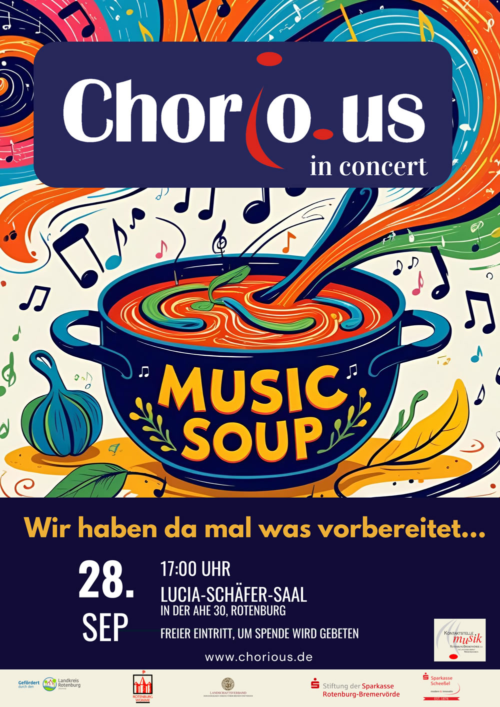 Am Sonntag den 28.09.2025 findet um 17 Uhr im Lucia-Schäfer-Saal in Rotenburg das jährliche Konzert von Chorious dem Chor der Kontaktstelle Musik Rotenburg Bremervörde e.V. statt. Dieses Chorkonzert ist ein Erlebnis, das ihr Herz berühren wird. Stellen Sie sich vor, Musik ist wie ein köstliches Essen, welches aus den unterschiedlichsten Gefühlen und Klängen besteht. Jede Note ist eine Zutat, die das Ganze zu einem einzigartigen Geschmackserlebnis macht. In diesem Konzert präsentieren wir Ihnen eine bunte Mischung an Stücken, darunter "Human", "Someone you loved" und "Walking on sunshine". Die Choreografien verleihen den Darbietungen eine zusätzliche Würze. Kommen Sie vorbei, denn Chorious "hat da mal was vorbereitet", so dass für jeden Geschmack etwas dabei sein wird. Der Eintritt zum Konzert ist frei, es wird um eine Spende für die musikalische Arbeit gebeten.